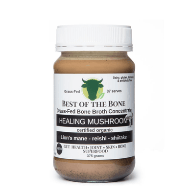 Grass-fed Best of the Bone Healing Mushroom bone broth concentrate with certified organic mushrooms (lion's mane, reishi, and shiitake). Bone broth has never been so medicinal ???? Legendary medicinal mushrooms have been added to the collagen-rich Best of the Bone bone broth concentrate to create a unique bone broth flavour (mushrooms, garlic, black pepper) that is a fantastic base for soups or sauces (mmm, the mushroom gravy we made was as good as we've experienced in any restaurant). A spoonful of the the Best of the Bone Healing Mushroom and hot water creates an instant protein rich, gut healing bone broth. You'll feel the energy in minutes. We've included an abundant serve of these adaptogens in our gut-healing, collagen-rich, real bone broth concentrate (again, NOT, a powder, but a rich, slow-cooked, nutrient dense broth.