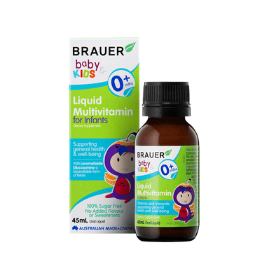 Brauer Baby & Kids Liquid Multivitamin for Toddlers is a scientifically developed vitamin and mineral formula specifically designed to help support your toddler's vitamin and mineral intake. It contains nutrients to help to support your child's healthy growth and development, including Zinc, Iodine, Vitamin E, Vitamin C, Betacarotene and active forms of Vitamin B2, B6, B9 and B12. It comes in a naturally delicious fruit cup flavour that's been given the thumbs up in taste tests by kids, and it's 99% sugar free!