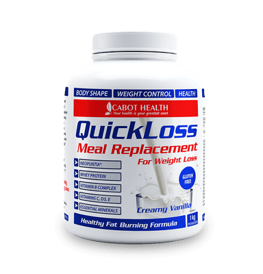 Cabot Health Quick Loss Meal Replacement Vanilla 1kg. QuickLoss helps to curb appetite, satisfy hunger and boost metabolism. It provides 25% of the Recommended Dietary Intake-RDI of vitamins and minerals per serve, to ensure you are getting the nutrition you need to be healthy and energetic. Contains NeOpuntia, a cactus fibre that creates a feeling of fullness and helps to reduce appetite. Contains added selenium and iodine to help support healthy thyroid function. Contains 18.3 grams of protein per serve.