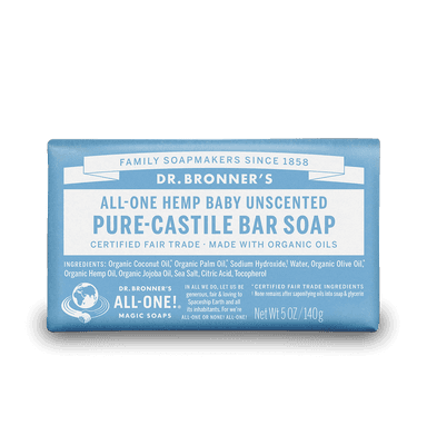With no added fragrance and double the olive oil, our Baby Unscented Pure-Castile Bar Soap is good for sensitive skin & babies too (though not tear-free!). Dr. Bronner's Bar Soap is made with certified fair trade ingredients and organic hemp oil for a soft, smooth lather that won't dry your skin. 100% biodegradable in a 100% post-consumer recycled wrapper.