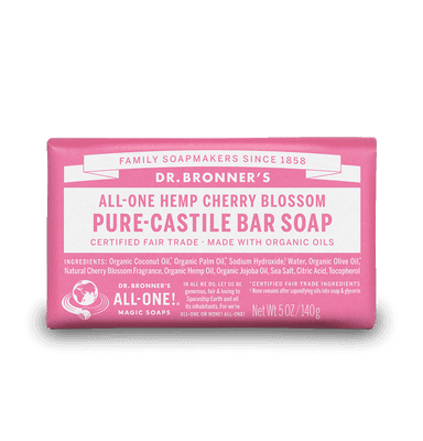 Sweet spring is in the air with our Cherry Blossom Pure-Castile Bar Soap. Dr. Bronner’s Bar Soap is made with certified fair trade ingredients and organic hemp oil for a soft, smooth lather that won’t dry your skin. 100% biodegradable in a 100% post-consumer recycled wrapper.