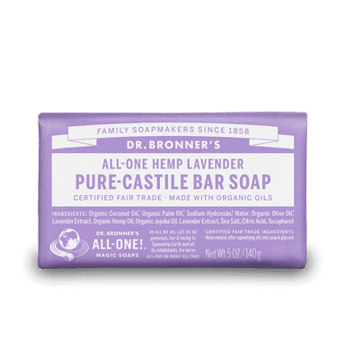 Dr. Bronners Lavender Bar Soap has been scented with pure lavender and lavandin oils to calm the mind and relax the body. Made with certified fair trade ingredients and organic hemp oil for a soft, smooth lather that will cleanse without drying or irritating your skin. Suitable to use on the whole family. 100% biodegradable in a 100% post-consumer recycled wrapper.