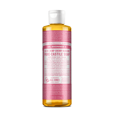 Sweet spring is in the air with our Cherry Blossom Pure-Castile Liquid Soap. Dr. Bronner’s soap is concentrated, biodegradable, versatile and effective. Made with organic and certified fair trade ingredients, packaged in a 100% post-consumer recycled bottle. All-One!