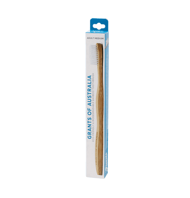 Grants biodegradable bamboo toothbrush is an eco-friendly way to brush your teeth. Our handles are made from 100% biodegradable and environmentally sustainable bamboo. The bristles are made from nylon which aren’t compostable but can be recycled. Break off the bristle head or remove the bristles with pliers and recycle as per your local recycling facility guidelines. The bare bamboo handle can then be composted and will safely return to the soil. Each toothbrush is individually sealed in a corn starch wrapper than can be composted and boxes can be recycled.