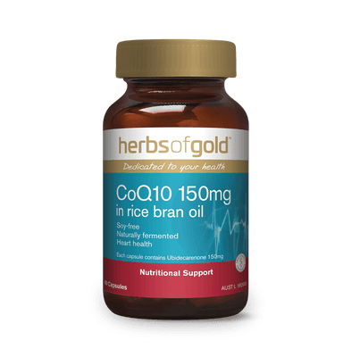 Herbs of Gold CoQ10 150mg contains naturally fermented coenzyme Q10 in a soy-free rice bran oil base.