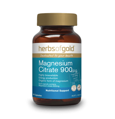 Herbs of Gold Magnesium Citrate 900 60 Vege-Caps contains Magnesium citrate, an organic form of magnesium, which is highly soluble and bioavailable to the body when compared to other forms of magnesium. This ensures the body is able to absorb and utilise the maximum amount of magnesium effectively. Magnesium is an essential mineral, which activates over 300 enzyme reactions in the body. It supports the formation of bones by regulating the absorption of Calcium and is a vital mineral needed for normal nerve and muscle function. Magnesium is important for cellular energy production, providing energy to every cell in the body. Magnesium is required for the conduction of nerve impulses and normal muscle contraction and therefore also helps in the prevention and relief of muscular cramps and spasms associated with a dietary magnesium deficiency. Exercise increases the body's requirement for magnesium. Magnesium may assist in the management and symptomatic relief of premenstrual syndrome and may help reduce the severity and frequency of migraine headaches. Magnesium Citrate 900 assists in the maintenance of general well-being and may be used for the prevention of a magnesium deficiency when dietary intake is inadequate.