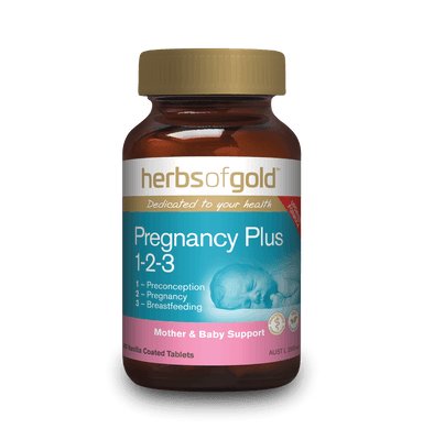 Herbs of Gold Pregnancy Plus 1 2 3 contains a blend of vitamins, minerals and nutrients to assist with the maintenance of both the mother and the baby during preconception, pregnancy and breastfeeding. This two-a-day formula provides optimal levels of nutrients to meet the increased nutritional demands during pregnancy and breastfeeding. A subtle vanilla flavour and smell, making these tablets easy to swallow for those with taste and smell hypersensitivities during pregnancy. Iodine requirements are increased during pregnancy and adequate maternal iodine levels are important for healthy brain development. To meet the increased demands of Iodine, Iodine supplementation is recommended to be taken prior to conceiving and throughout pregnancy and breastfeeding. Folic acid, which if taken daily for one month before conception and during pregnancy, may reduce the risk of women having a child with birth defects of the brain and/or spinal cord such as the neural tube defects known as spina bifida and anencephaly. Choline is required for the healthy development of the brain and nervous system during pregnancy and whilst breastfeeding. Iron requirements are increased during pregnancy and iron is necessary for the formation of haemoglobin which transports oxygen in red blood cells to the tissues. Zinc deficiency is common in pregnant and lactating women and is important for DNA replication, cell division and growth.