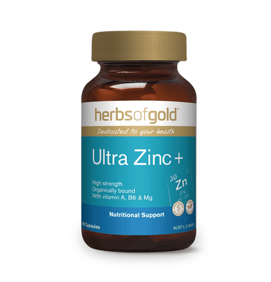 Herbs of Gold Ultra Zinc Plus is a high-strength formula containing 50mg of Zinc plus Vitamin A, B6 and magnesium to support healthy skin, collagen production and promotes healthy immune function. Zinc plays a vital role in the formation of connective tissue, teeth, bones, nails, hair and skin.