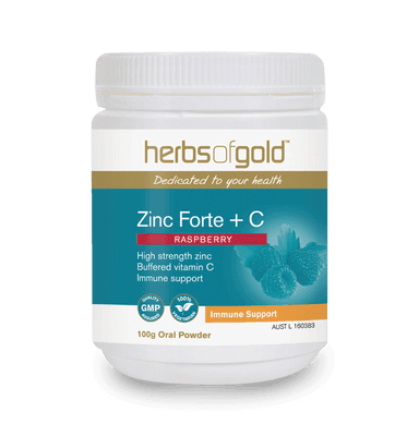Herbs of Gold Zinc Forte plus C contains a high-quality source of Zinc and vitamin C with essential co-factors including vitamin B6, beta-carotene and magnesium for increased bio-availability. Zinc is a vital nutrient involved in healthy growth, immunity, reproduction and neurological functions. Zinc and Vitamin C are powerful antioxidants that help protect the body from free radical oxidation damage. This unique formula may be beneficial for those that may be at risk of zinc deficiency. This easy-to-take powder with a natural and yummy tasting raspberry flavour also supports skin health and renewal and the formation of healthy new connective tissue. Herbs of Gold Zinc Forte plus C assists in the maintenance of general health and well-being.
