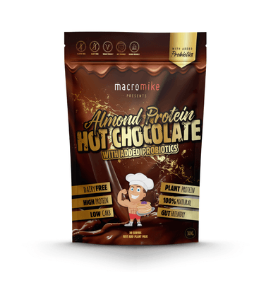 MACRO MIKE Protein Hot Chocolate - Almond With Added Probiotics - mix with hot water or your plant milk of choice for a decadent tasting healthy treat that packs a protein punch!