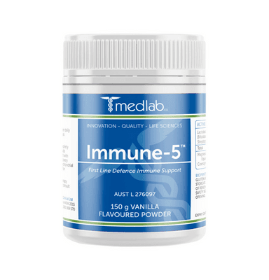 Immune-5™ is a scientifically-based combination of select first line immune modulating nutrients, together with two specific probiotic species shown to assist with immune function. ResistAid™ is a prebiotic soluble fibre with immune modulating properties while Lactoferrin is a naturally occurring protein found in the body with a positive effect on the immune system. Colostrum provides important innate immune supporting proteins including the antibody IgG that both activates and modulates the body defence processes.