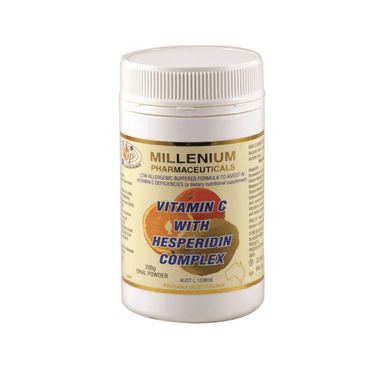 Millenium Pharmaceuticals Vitamin C with Hesperidin Complex supports immune system health and may reduce the severity and duration of colds and flu. It may also assist in the relief of the symptoms of hayfever, and assists in the maintenance of peripheral circulation.