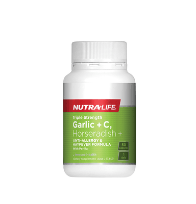 NutraLife Triple Strength Garlic + C, Horseradish + is used to help relieve hayfever and cold symptoms, such as mucous and nasal congestion.