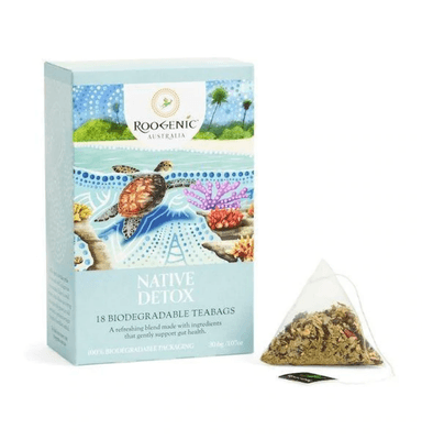 Roogenic Australia Native Detox is a refreshing blend made with ingredients that gently support gut health. The tea is great hot or chilled.