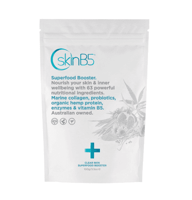 SkinB5’s unique superfood booster also features the benefits of Marine Collagen (bioactive collagen peptides VERISOL®), Australian Organic Hemp Protein, Organic Zinc, Maca, Probiotics Lactobacillus & Bifidobacterium, Prebiotics, Vitamins A, B5, C, D & E, Omega-3, -6 & -9, Silica, Ashwagandha, Alkalising Greens & High Antioxidant Superfruits.