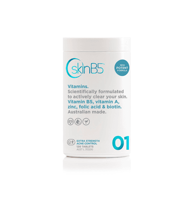 SKINB5 Acne Control Extra Strength is the first step in the Natural 4 step program that works from the inside out to manage your acne. This extra strenght formulation helps to control and manage more serious acne. SkinB5 is a patented formula containing a proprietary blend of nutrients designed to fight acne and skin problems at the source. SKINB5 helps control more serious acne by controlling skin oil production, making it suitable for acne sufferers with very oily skin. It also supports skin healing and renewal, a healthy immune function and povides powerful anti-blemish antioxidants.
